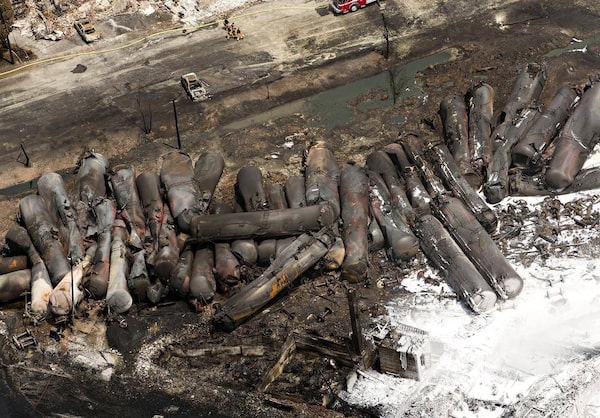 The downtown core lays in ruins as fire fighters continue to water smoldering rubble Sunday, July 7, 2013 in Lac Megantic, Quebec after a train derailed ignited tanker cars carrying crude oil.Ryan Remiorz/The Canadian Press