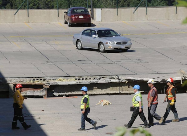 Emergency workers examine the parking lot at the Algo Centre Mall in Elliot Lake, Ont., where a section of the roof collapsed killing two women in June, 2012.Fred Lum/The Globe and Mail