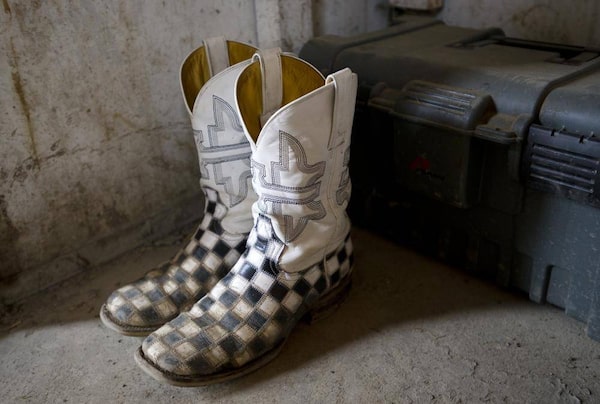 Chuckwagon driver Jason Glass's boots compete with the checkerboard design are sit in the barn at the Calgary Stampede grounds in Calgary , Ab. Saturday, July 6, 2013.Kevin Van Paassen/The Globe and Mail