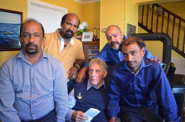 Former Tamil refugees (left to right) Suhapiramam Annalingam, Siva Mehanathan, Shanmuga Paul and Baskaran Nadarajah pose with Gus Dalton at his home on the 30th anniversary reunion of their rescue in 2016.Cyrus Sundar Singh