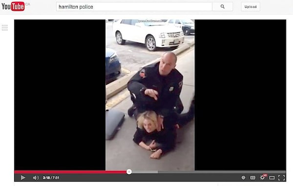 Screen grab from a video that shows Hamilton police constables Mark Morelli and Chantelle Wilson struggling with a screaming young woman on a strip-mall sidewalk.