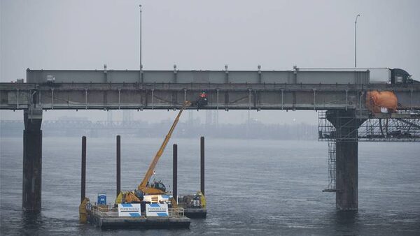Workers are shown beneath the 'superbeam' on the Champlain Bridge span in Montreal on Dec. 1, 2013. The federal government has pledged a replacement for the bridge three years ahead of schedule.Graham Hughes/The Canadian Press