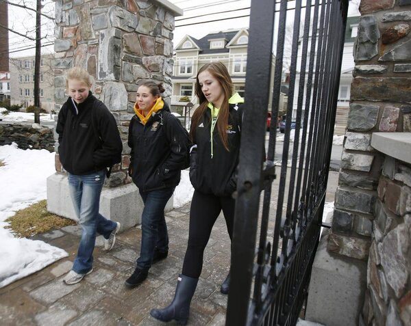 Dalhousie University women's hockey team players, from left, Miranda McMillan, Isabelle Germain and Laura Brooks, walk through the gates to campus in Halifax on Feb. 21, 2013. Veteran members of the hockey team were suspended over a hazing ritual.Paul Darrow/The Globe and Mail