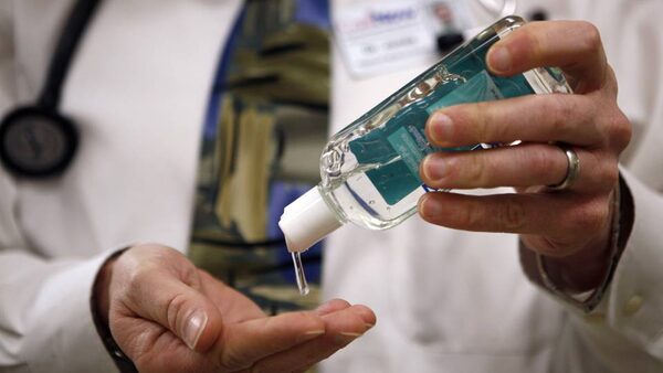 Doctor uses hand sanitizer.