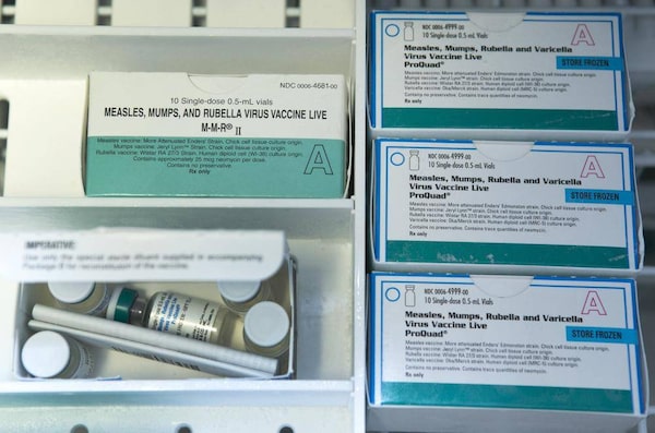 This Thursday, Jan. 29, 2015, file photo, shows boxes of the measles, mumps and rubella virus vaccine (MMR) and measles, mumps, rubella and varicella vaccine inside a freezer at a doctor's office in Northridge, Calif.Damian Dovarganes/The Associated Press
