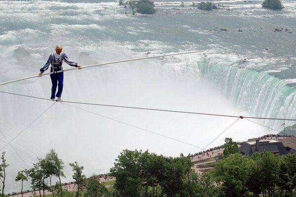 But he never did plummet, not after he learned his lesson crashing to the earth in Toronto. On the wire, he was as solid as a stone column. "He had the athleticism of Michael Jordan," Mr. Phillips said. He avoided wet wires and high winds, and the only thing that fazed him was a steep grade: His most challenging walk came in Niagara Falls, Ont., in 2005, when he crossed between the Niagara Casino and the Skylon Tower, which is some 200 feet higher. He had walked higher, and farther, and even blindfolded, but the steepness of the climb gave him pause.
