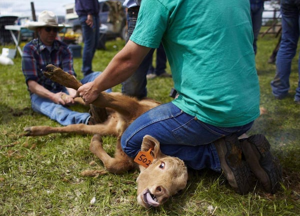 A calf bawls during a branding on a 100 year-old ranch near Cremona, Alta., Friday, June 1, 2012. Over 300 calves were branded and will head out to summer pastures. Branding time is a western tradition and brings together friends, neighbors and families for a day of work with a large barbecue dinner afterwards.Jeff McIntosh/The Canadian Press