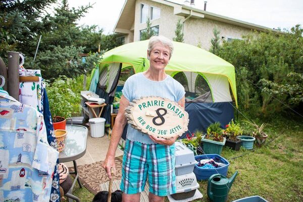71-year-old widow Helen Fraser from High River is photographed outside of her temporary living accommodations on July 24, 2013. She has been camping in a tent on a strangers lawn at the edge of town ever she she was displaced after the floods in June. She holds the address sign which she took from her flooded trailer that she lived in with her pets.Chris Bolin/The Globe and Mail