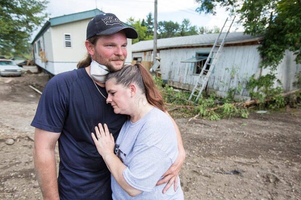 John Willis holds his common-law wife Ronda Kalman outside of their trailer in High River. The couple finally got access to their home 32 days after the flood hit.Chris Bolin/The Globe and Mail