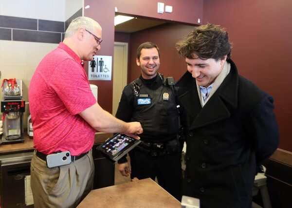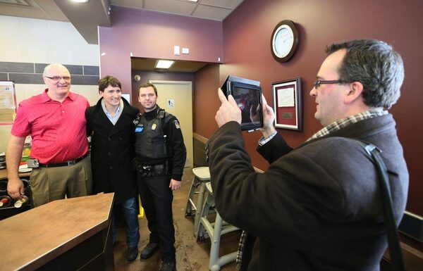 Liberal leadership candidate Justin Trudeau with Tim Hortons shop owner Marc Tremblay and a police officer in St-Bruno, Quebec, February 21, 2013.Christinne Muschi/The Globe and Mail