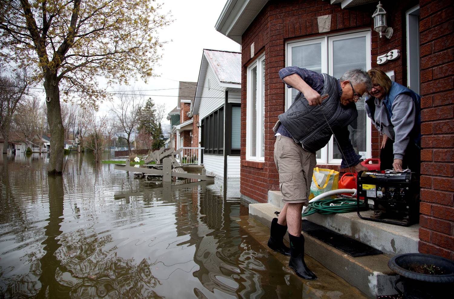 Iven Ponce with his spouse Danielle tries to start his generator to pump water out of their home in Deux-Montagnes, Quebec.Christinne Muschi/Reuters