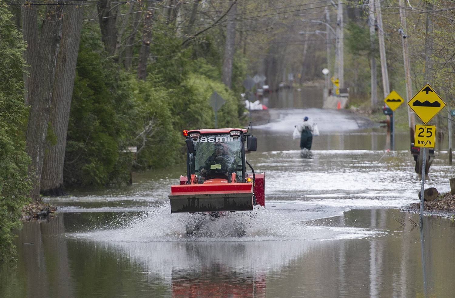 A small backhoe moves along a flooded road on L'lle-Cadieux, west of Montreal.Graham Hughes/The Canadian Press