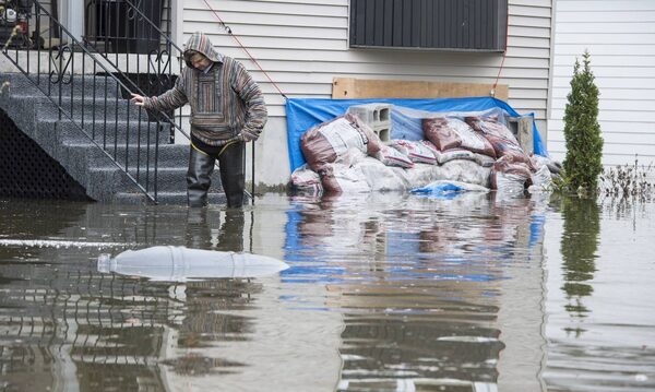 A man checks the water level infant of his barricaded house on a flooded street in the Cartierville district of Montreal.Paul Chiasson/The Canadian Press