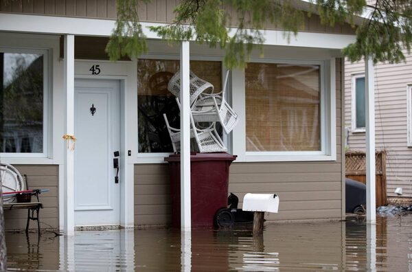 Patio furniture is stacked up above the water in a flooded neighbourhood in Deux-Montagnes, Quebec.Christinne Muschi/Reuters