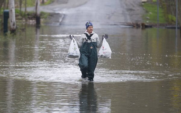 A woman carries supplies along a flooded road on L'lle-Cadieux west of Montreal.Graham Hughes/The Canadian Press