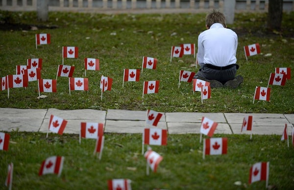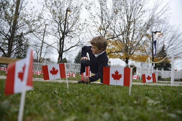 Grade 2 student Tom Mercer plants a Canadian flag in the Remembrance Garden.Fred Lum/The Globe and Mail