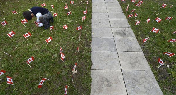 Students from the Country Day School in King City, ON., plant flags beside the school's flagpole on Nov 1 2013.Fred Lum/The Globe and Mail