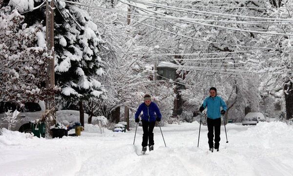 Lia Codrington (L) and Michal Leckie ski down an Ottawa street after the season’s first major snowstorm.Dave Chan/The Globe and Mail
