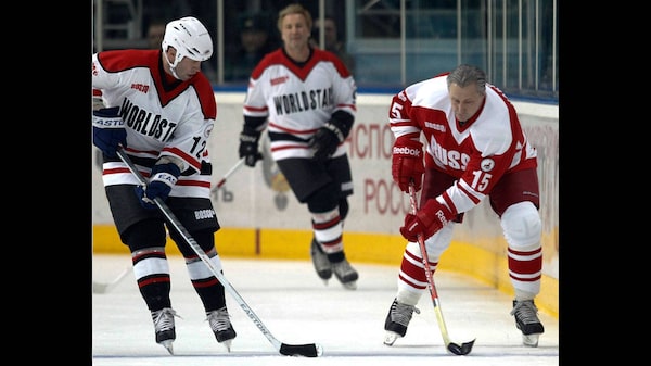 Canadian former hockey players Phil Esposito, right, and Dennis Hull, centre, greet former rival Russian hockey player Alexander Maltsev during the starting ceremony for an exhibition game in Moscow on Feb. 25, 2012 between teams of Russian and world stars to mark the anniversary of U.S.S.R.-Canada 1972 Summit Series.Grigory Dukor/Reuters/Reuters