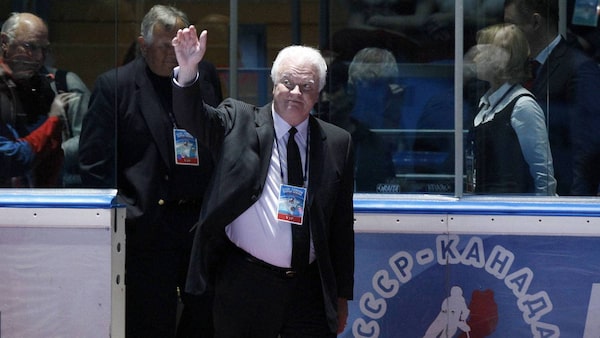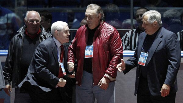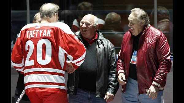Canadian former hockey players Phil Esposito, right, and Dennis Hull, centre, greet former rival Russian, hockey legend Vladislav Tretiak, during an exhibition game in Moscow on Feb. 25, 2012 between teams of Russian and world stars to mark the anniversary of U.S.S.R.-Canada 1972 Summit Series.Grigory Dukor/Reuters