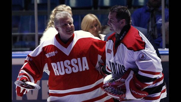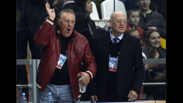 Canadian former professional ice hockey player Phil Esposito, left, reacts next to legendary Russian hockey player Vladimir Petrov as they stand the bench during an exhibition game in Moscow on Feb. 25, 2012 between teams of Russian and world stars to mark the anniversary of U.S.S.R.-Canada 1972 Summit Series.Grigory Dukor/Reuters