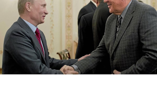 Russian Prime Minister Vladimir Putin greets Canadian former professional hockey player Phil Esposito at the Novo-Ogaryovo residence outside Moscow on Feb. 24, 2012.Misha Japaridze/REUTERS