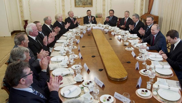 Russian Prime Minister Vladimir Putin speaks to Canadian and Russian former legendary ice hockey players, coaches and officials at his residence outside Moscow on Feb. 24, 2012.Pool/Reuters/Reuters