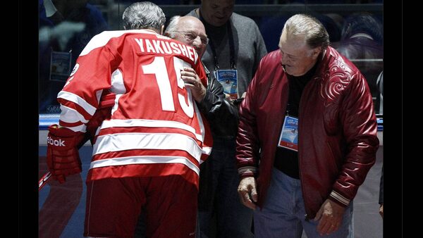 Canadian former hockey players Phil Esposito, right, and Dennis Hull, centre, greet former rival Russian hockey player Alexander Yakushev during the starting ceremony for an exhibition game in Moscow on Feb. 25, 2012 between teams of Russian and world stars to mark the anniversary of U.S.S.R.-Canada 1972 Summit Series.Grigory Dukor/Reuters