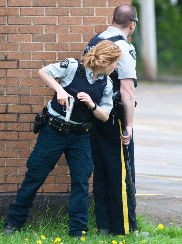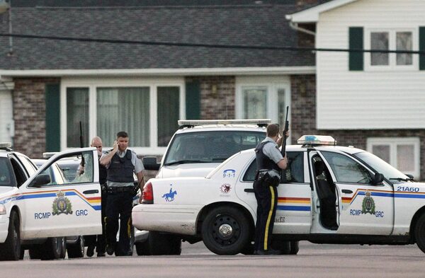 Codiac RCMP officers take cover behind their vehicle in Moncton, New Brunswick.Viktor Pivarov