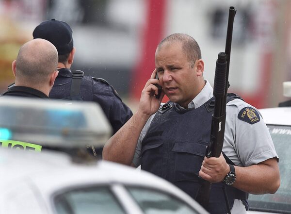 Police officers man a roadblock in Moncton, New Brunswick, Thursday, June 5, 2014, searching for a suspect who shot and killed three Royal Canadian Mounted Police officers the day before. Wednesday. Police have identified a suspect as 24-year-old Justin Bourque of Moncton. Two other officers were wounded in Wednesday's shooting.Andrew Vaughan/The Canadian Press