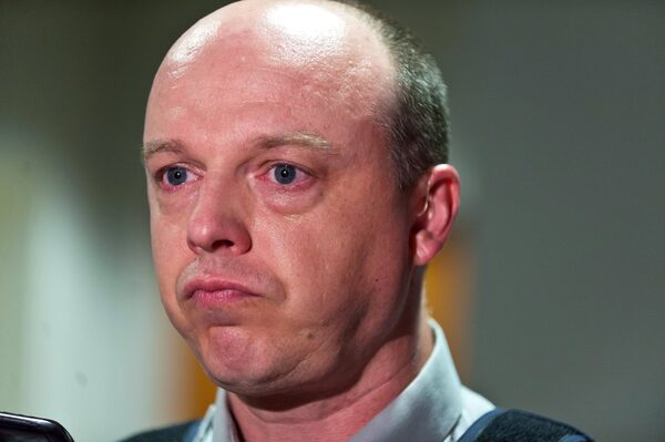 RCMP officer Damien Theriault holds back tears while addressing the media during a press conference at City Hall in Moncton, Wednesday June 4, 2014. The RCMP in New Brunswick says an undisclosed number of people have been shot and a manhunt is underway in the north end of Moncton for a man armed with guns.Marc Grandmaison