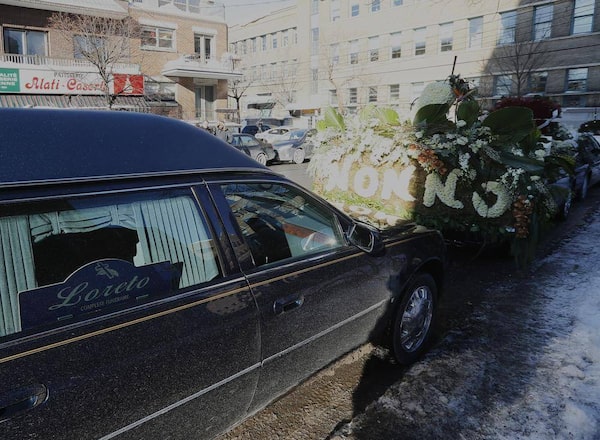 The hearse and procession flowers sit outside the church during Mr. Rizzuto’s funeral.CHRISTINNE MUSCHI/The Globe and Mail