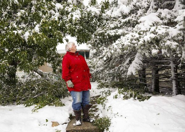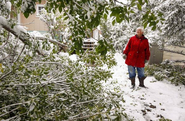 Jean Rivers inspects the damage to her trees as snow continues to fall in Cremona, Alta., Tuesday, Sept. 9, 2014. Environment Canada issued a snowfall warning for Calgary, and much of the rest of Southwestern Alberta.Jeff McIntosh/The Canadian Press