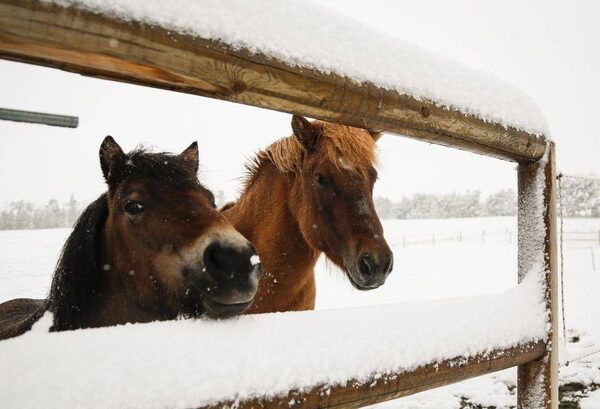 Two ponies peer out from their pasture as snow continues to fall in Cremona, Alta., Tuesday, Sept. 9, 2014. Environment Canada issued a snowfall warning for Calgary, and much of the rest of Southwestern AlbertaJeff McIntosh/The Canadian Press