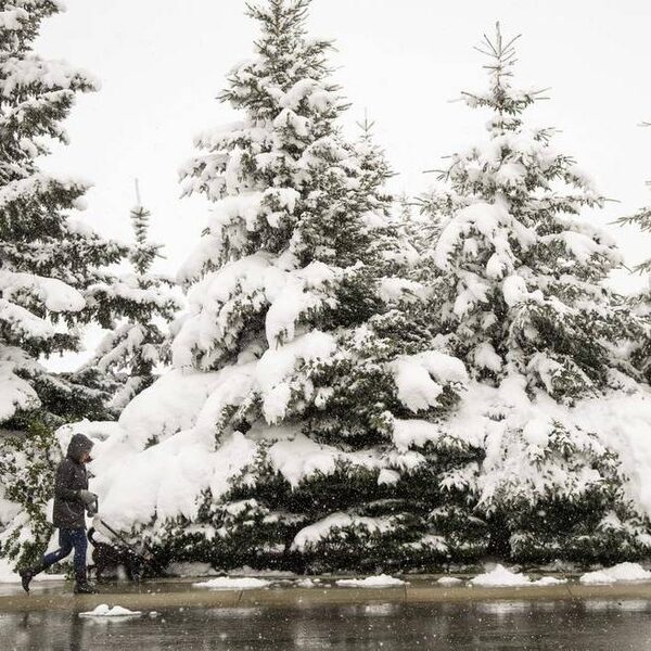 A woman walks her dog past snow laden trees as snow continues to fall in Cremona, Alta., Tuesday, Sept. 9, 2014. Environment Canada issued a snowfall warning for Calgary, and much of the rest of Southwestern Alberta.Jeff McIntosh/The Canadian Press
