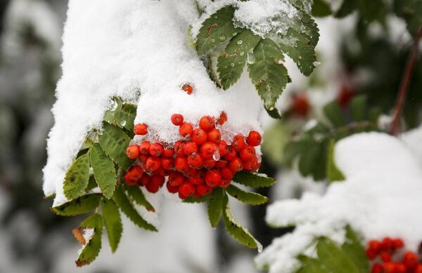 Snow accumulates on rowan berries as snow continues to fall in Cremona, Alta., Tuesday, Sept. 9, 2014. Environment Canada issued a snowfall warning for Calgary, and much of the rest of Southwestern Alberta.Jeff McIntosh/The Canadian Press