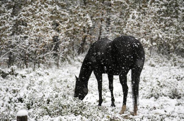 A grazes a snow covered pasture during a late summer snow storm near Calgary, Alta., Monday, Sept. 8, 2014. Snow fall warnings have been issued for much of the province over the next couple of days./Jeff McIntoshJeff McIntosh/The Canadian Press
