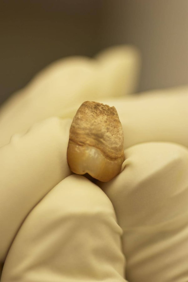 The upper right third molar of Naia, which was used for both radiocarbon dating and DNA extraction. The tooth is held by ancient genetics expert Brian Kemp of Washington State University, who led the genetic research on the skeleton.