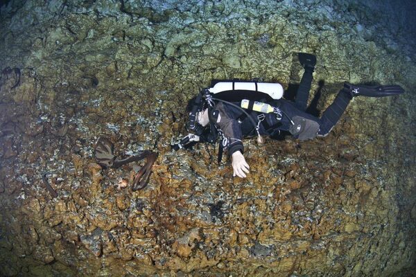 Alberto Nava at 145-ft depth in Hoyo Negro, inspecting a forelimb of an extinct Shasta ground sloth, one of two sloth species found in the cave. The Shasta ground sloth has not previously been found so far south in the Americas.