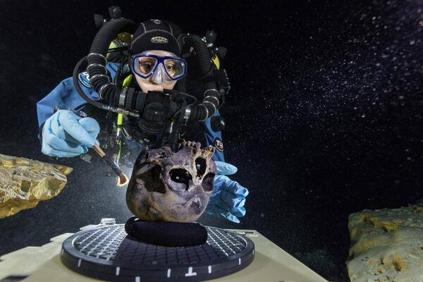Cave diver Alexandro Alvarez inspects the newly-discovered skull of Naia, the 12,000-13,000 year-old human skeleton discovered in a submerged cave on the Yucatn peninsula of Mexico.