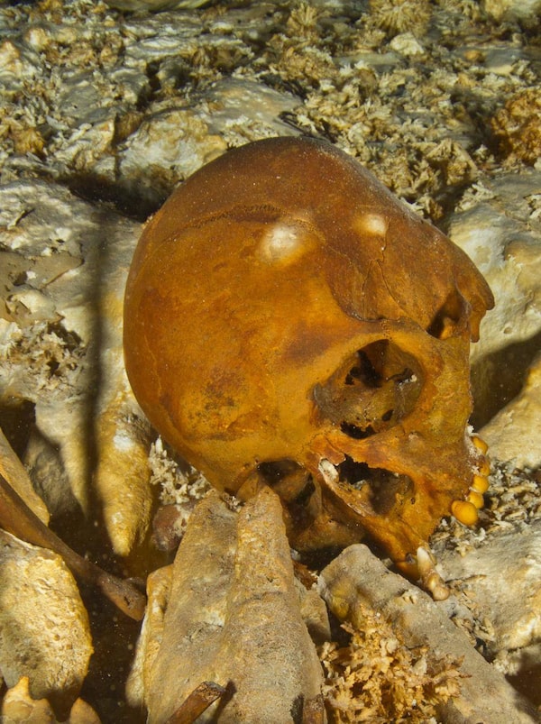 The skull of Naia on the floor of Hoyo Negro, as it appeared in December 2011, having rolled into a near-upright position.