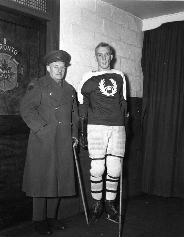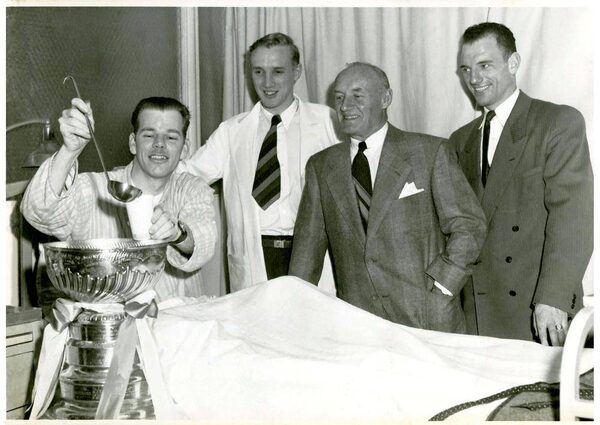 An unknown patient at Toronto’s Sunnybrook Hospital in 1951 gets a moment of glory with the Stanley Cup, accompanied by, from left: Dr. Hugh Smythe, father Conn Smythe and Leafs player Ted (Teeder) Kennedy.