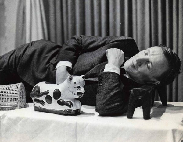Dr. Smythe one of his large collection of headrests, a pastime that stemmed from his interest in pain referred from the neck.