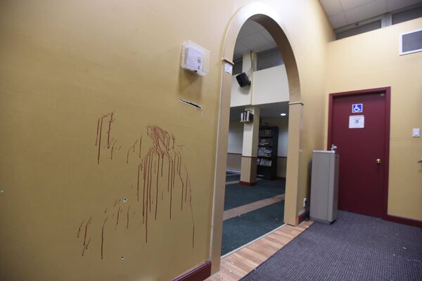 Other signs bear witness to desperate struggles for survival. At the front of the prayer room, a heavy trail of blood leads down the stairs to the basement and into a back room. Mr. Haroun said it belongs to a man who had been shot in the lower leg and ran downstairs in an attempt to escape the gunfire.