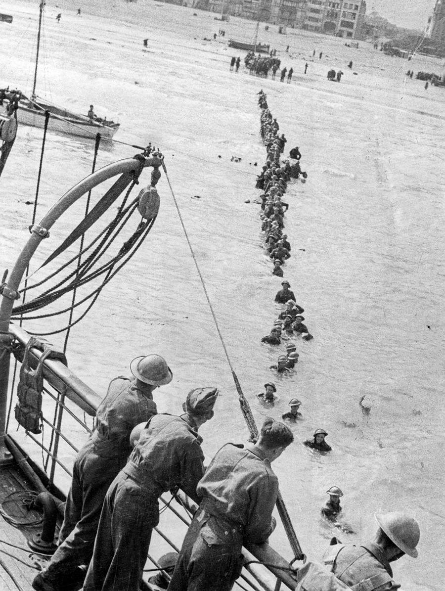 After a successful emergency sealift from a beachhead at Nazi-occupied Dunkirk, France, British and French soldiers arrive safely at an unknown British port, in June 1940.