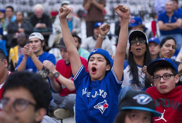 Blue Jays fans cheer on their team against the Texas Rangers at Nathan Phillips Square in Toronto on Oct. 12, 2015.Kevin Van Paassen/The Globe and Mail