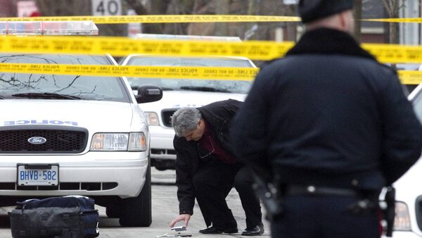 A member of the Police Special Investigations Unit inspects a used shell casing after Michael Eligon was fatally shot by the Police after allegedly threatening officers with scissors in Toronto on Friday February 3, 2012.Chris Young/The Globe and Mail