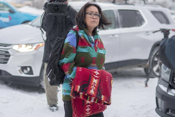 Colten Bouchie’s mother, Debbie Baptiste, walks to the Battleford, Sask., court during the first day of the trial of Gerald Stanley, the farmer accused of killing her 22-year-old son.Liam Richards/The Canadian Press