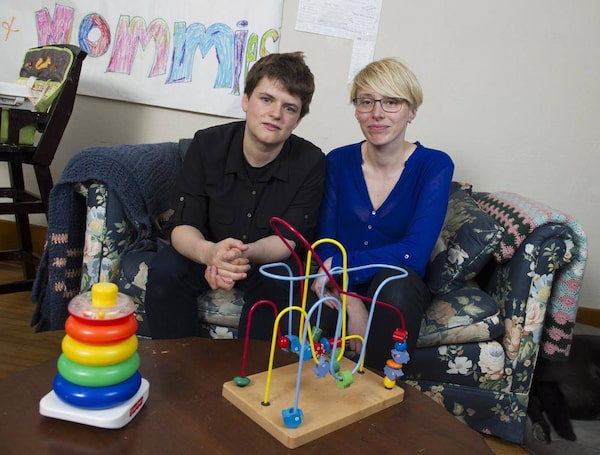 Kate Taylor (left) and partner Agata Durkalec are photographed in their Winnipeg home on Thursday, April 2, 2015. The couple recently encountered homophobic discrimination while searching for daycare for their infant daughter.David Lipnowski/The Canadian Press
