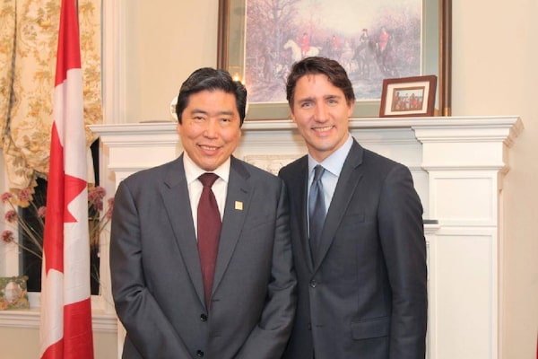 Shenglin Xian, left, president of Shenglin Financial Group Inc., the principal investor in Wealth One, one of Canada’s newest Schedule 1 banks, appears with Prime Minister Justin Trudeau during a meeting with Chinese Canadian representatives from the GTA.
